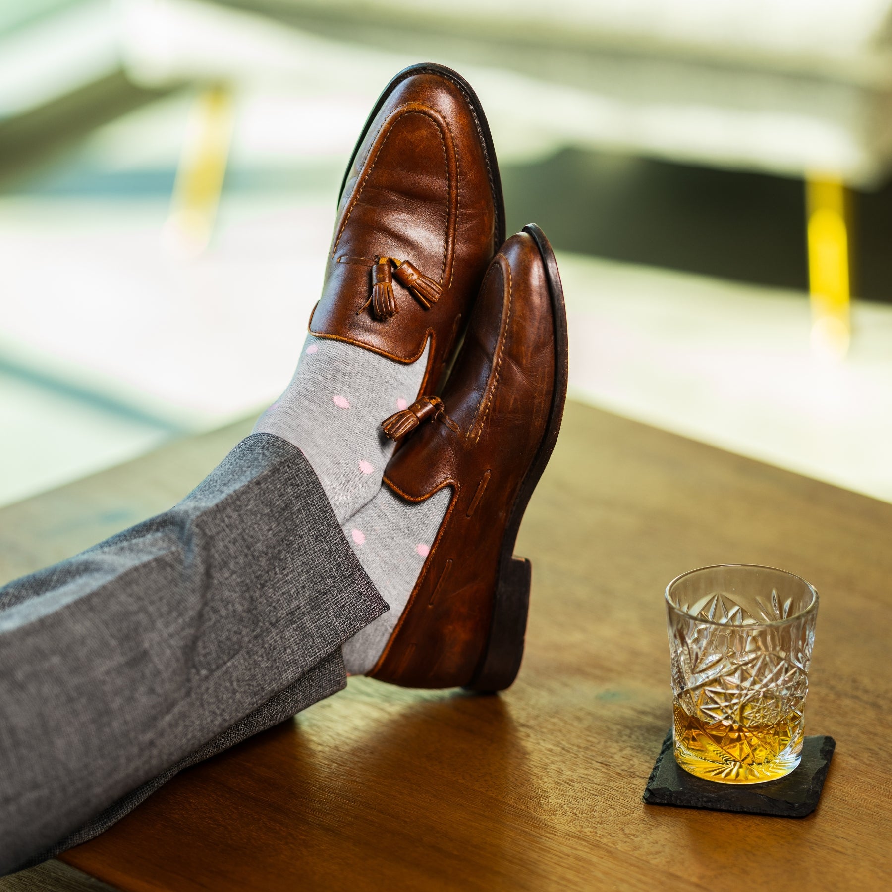 Pair with charcoal or grey trousers and brown leather shoes for an elegant everyday look, or style with lighter tailoring to highlight the sock’s subtle contrast and warmth.