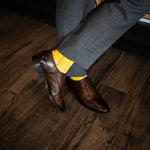 Try them with a navy or grey suit, a white dress shirt, and some dark brown dress shoes. Pair with a navy tie, and a yellow pocket square to bring it all together for the perfect seasonal look.