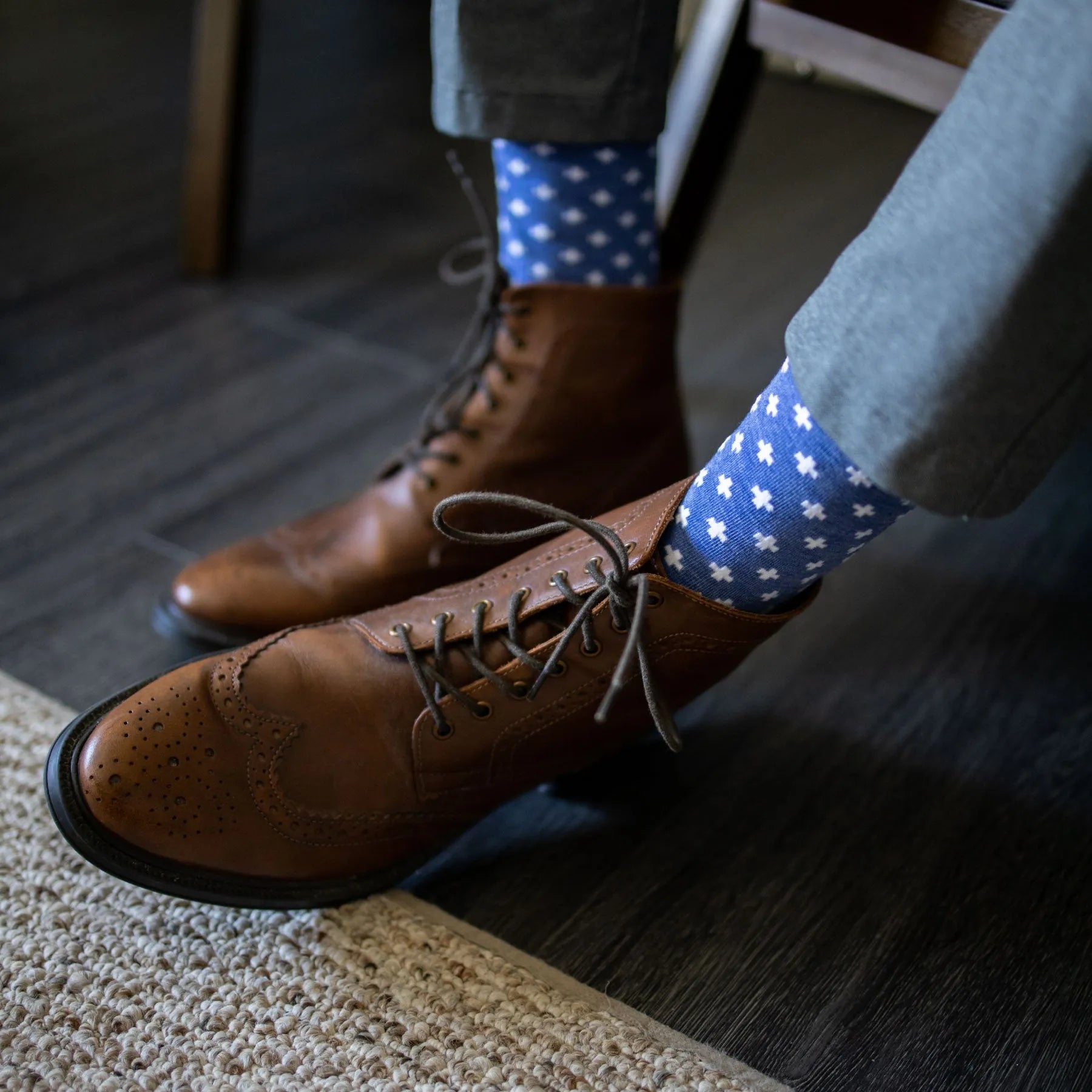 Man sitting with legs crossed wearing heathered blue socks with white hatches and dress shoes