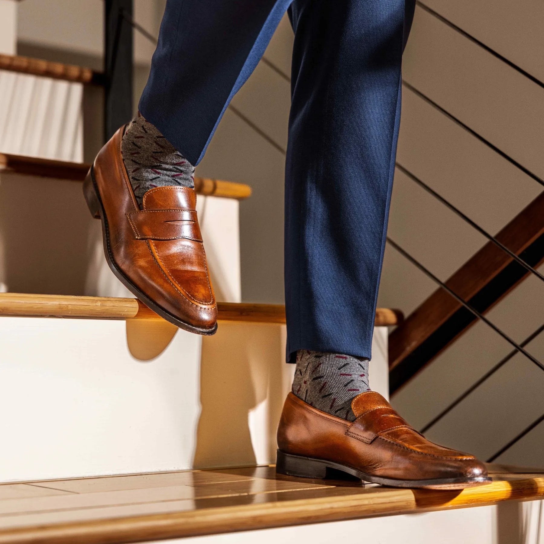 A classic grey sock with a unique deep red and black X pattern. We recommend pairing these with a navy suit, brown leather loafers, and a white dress shirt.