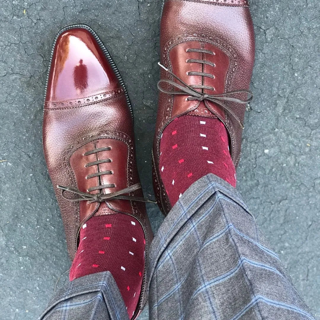 Man wearing cranberry socks with red and powder blue micro-squares