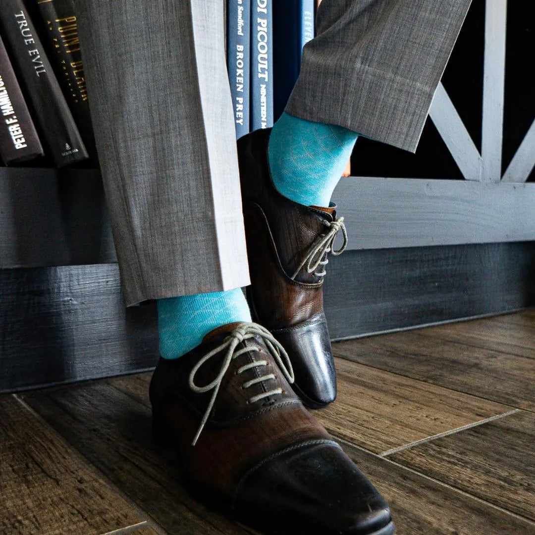 Turquoise blue men's dress sock with white contrasting diamond pattern